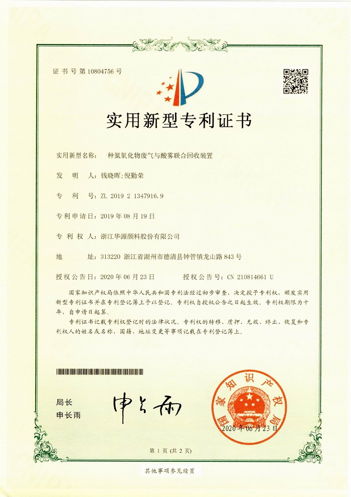 近日,升華集團所屬企業華源顏料6項實用新型專利獲國家知識產權局授權。這6項專利分別是:《一種氨氮廢水與酸霧的聯合回收處理裝置》、《一種工廠雨水收集利用裝置》、《一種低壓蒸汽與廢酸氣聯合回收裝置》、《一種投料倉》、《一種振動給料器》、《一種氮氧化物廢氣與酸霧聯合回收裝置》。