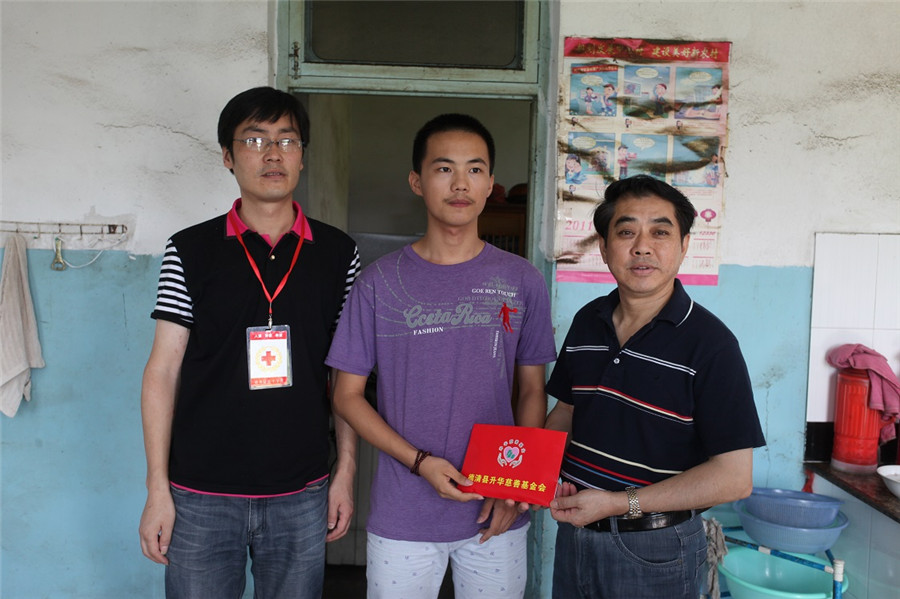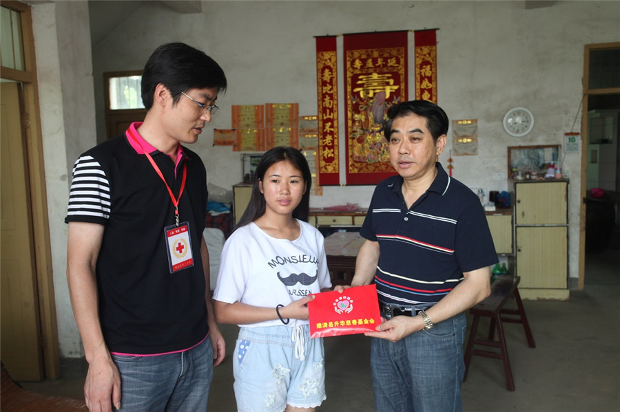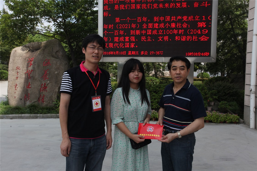 當天,受吳夢根一家人的委托,鮑希楠帶隊,縣紅十字會及升華慈善基金會相關部門負責人向首批5位大學生或準大學生送去了總共5萬元的博愛助學金。